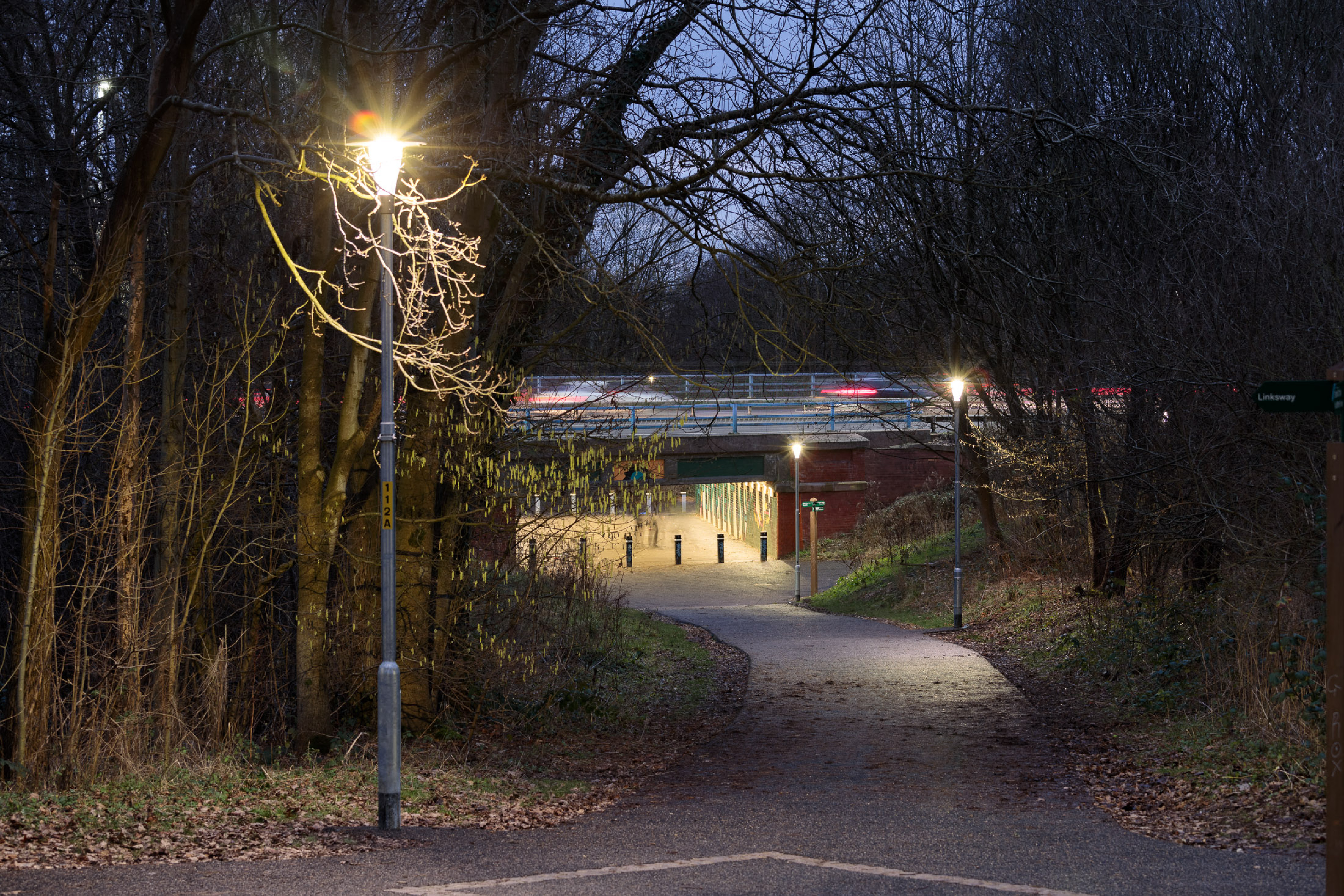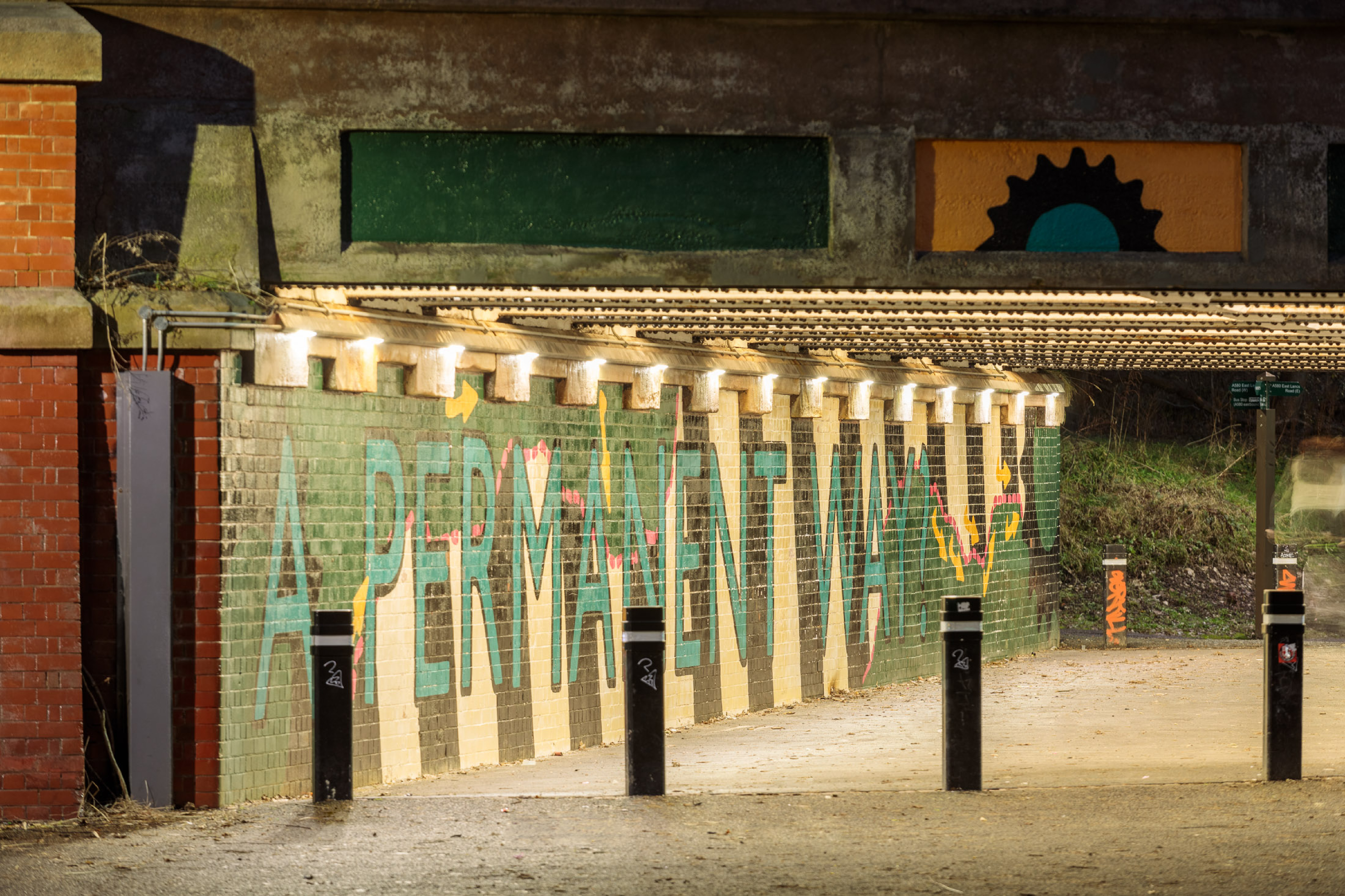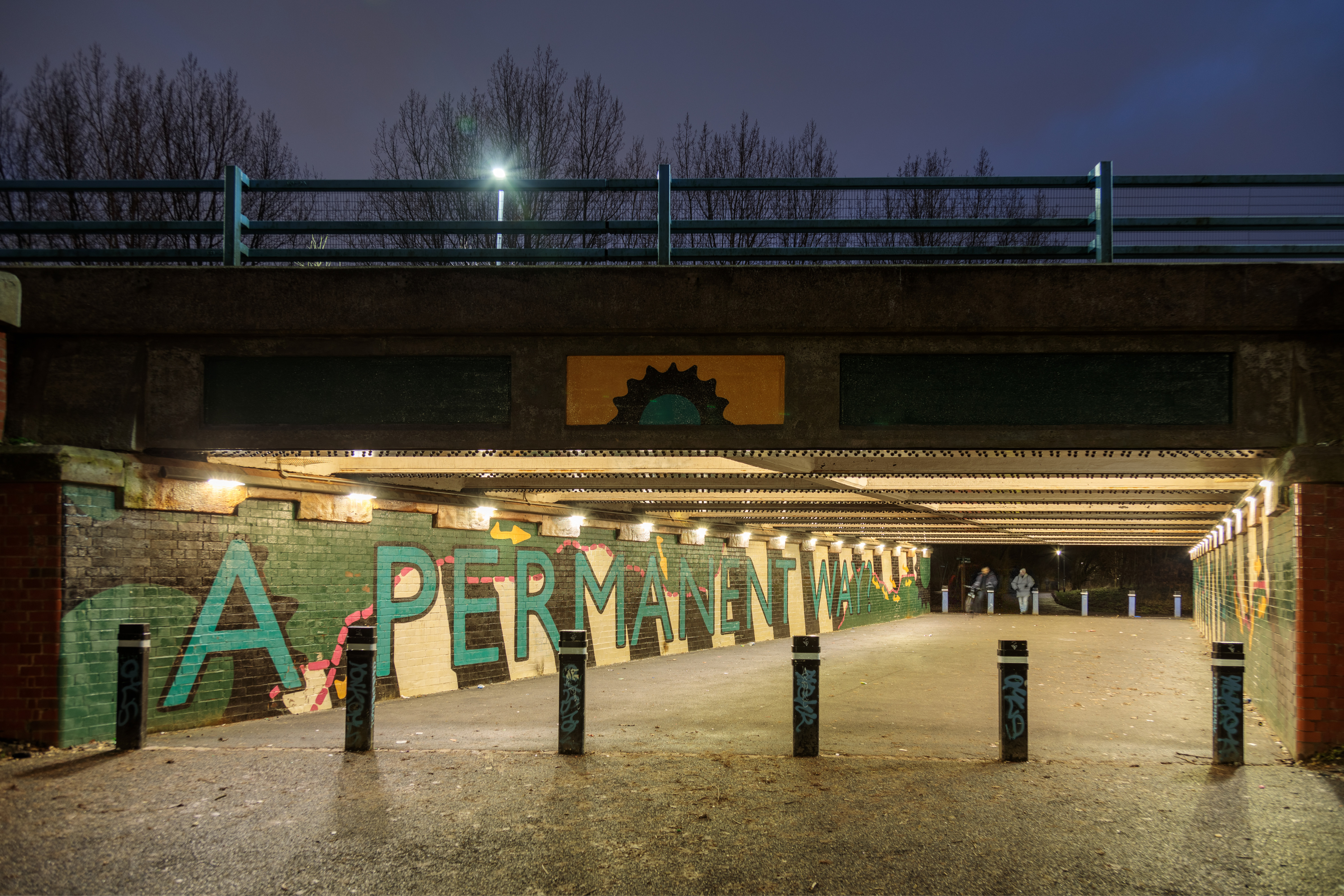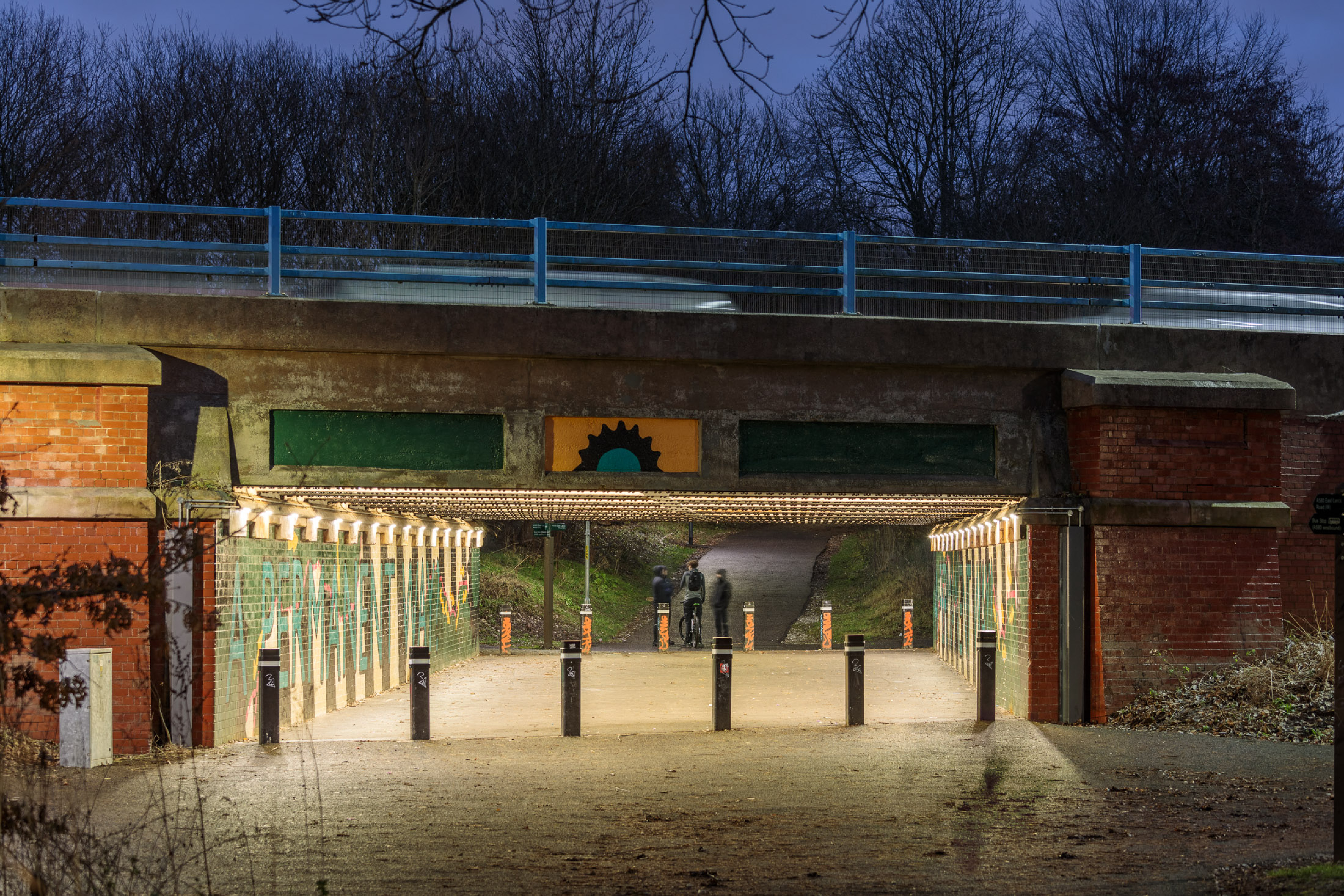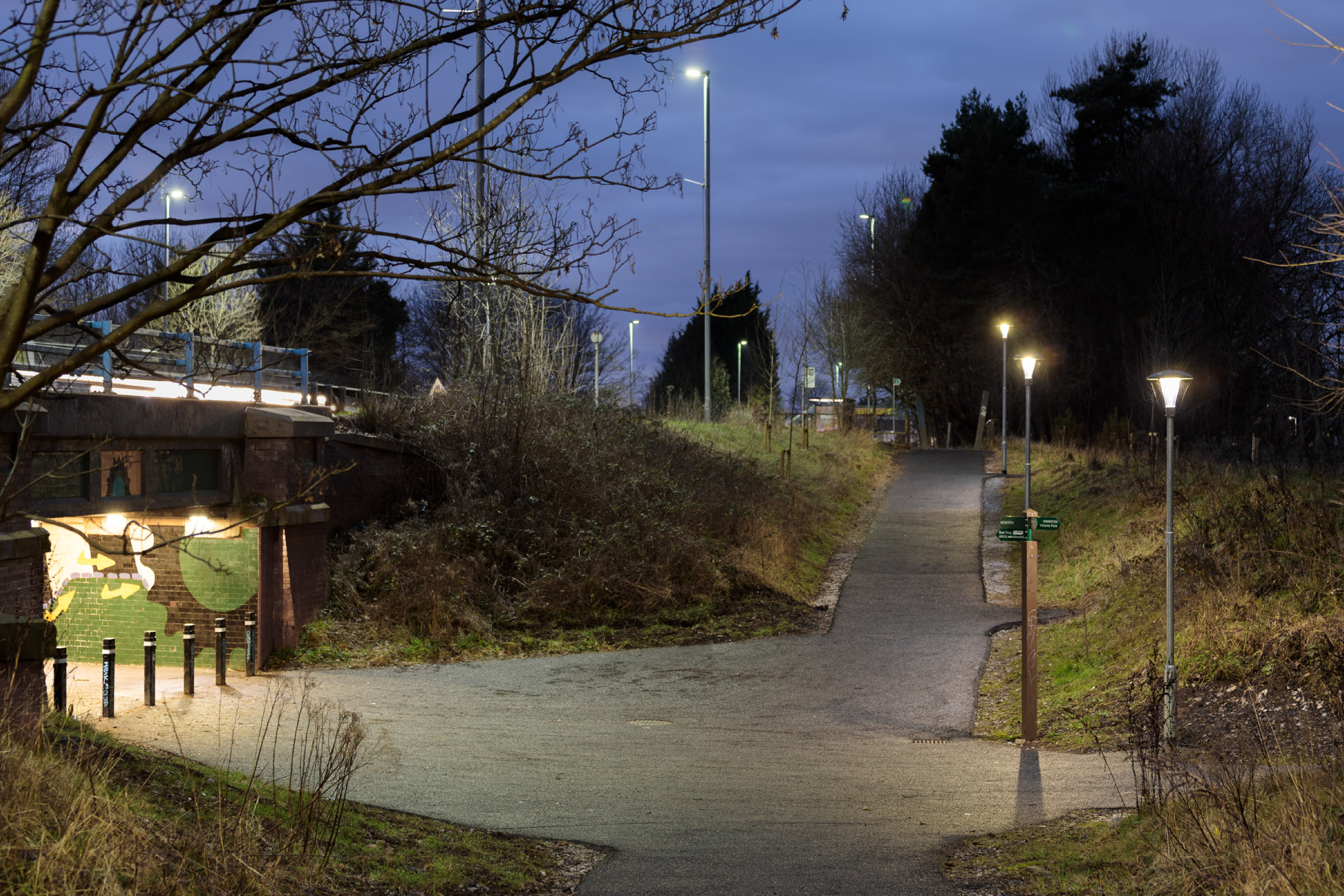 Le long de la voie, plusieurs zones non éclairées étaient sous-utilisées et commençaient à devenir des lieux propices aux comportements inadaptés, tels que le vandalisme. C’est précisément ce qui a incité la municipalité de Salford à lancer un projet de réhabilitation. A certains endroits, les pistes ont été élargies et le revêtement a été remplacé. Une œuvre d’art et des bancs ont été installés pour encourager les usagers à se poser, au lieu de ne faire que passer.