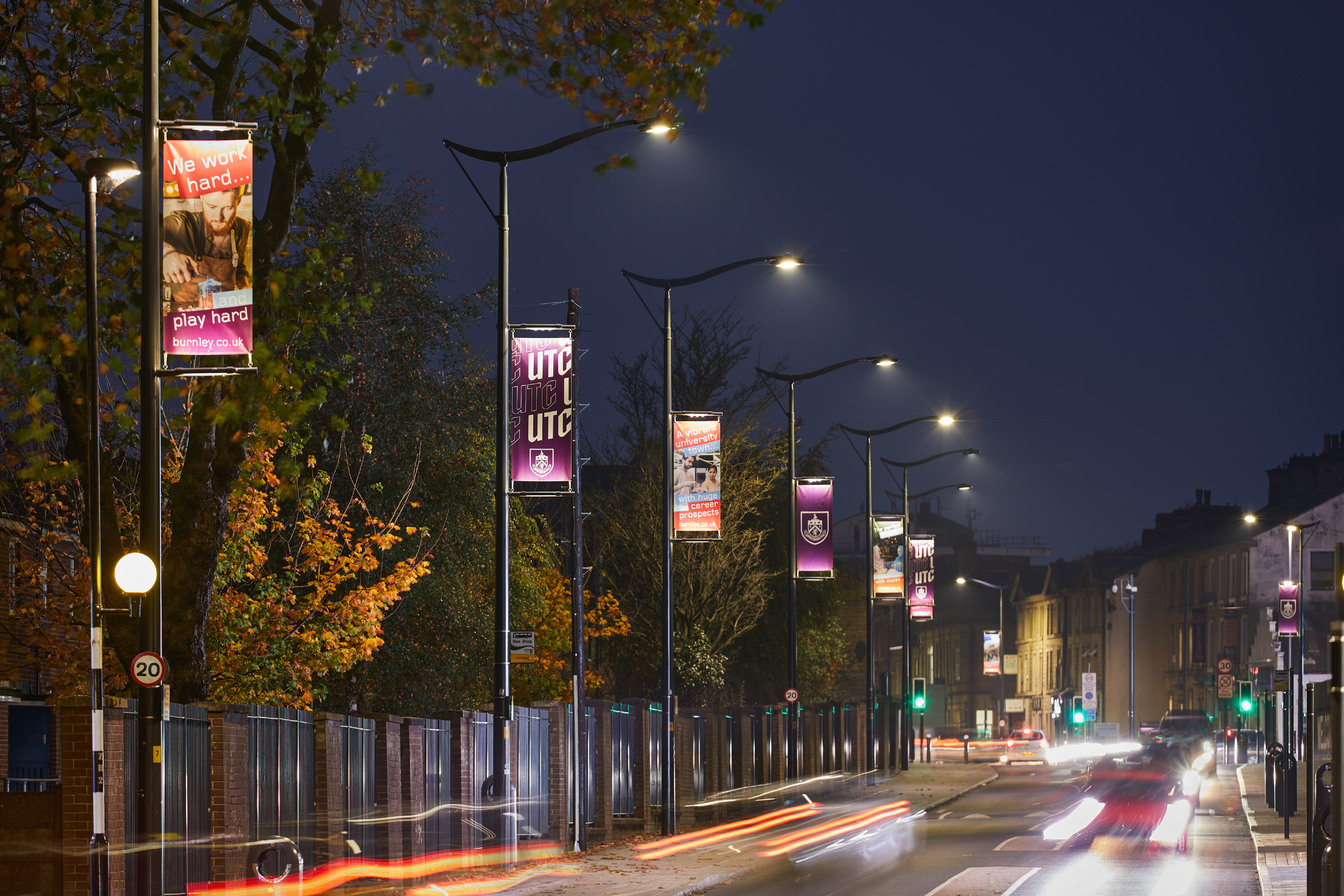 Le nouvel aménagement de Turf Moor Way repose sur le luminaire FLEXIA FG, installé sur des consoles LUTECIA, dans une teinte foncée élégante. Résultat : une esthétique raffinée et urbaine qui sublime l’identité de la rue. Des bras de bannière coniques illuminés viennent compléter l’ensemble, créant un décor vivant et propice à la célébration des événements locaux.