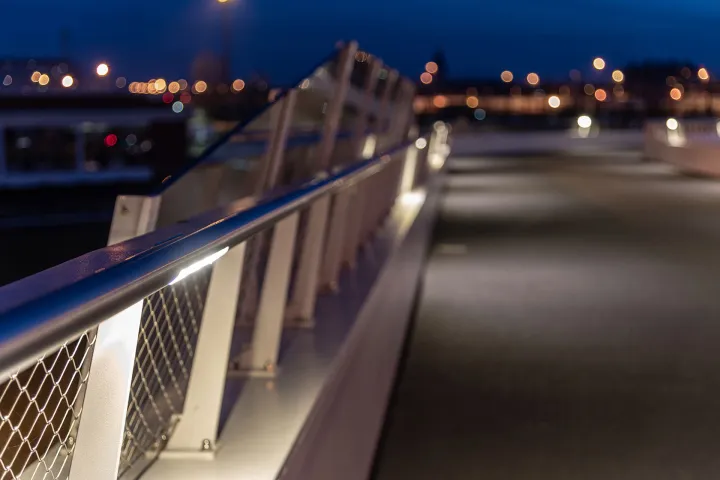 Om optimaal aan die technische en kwaliteitseisen te voldoen, koos de stad Antwerpen voor HANDRAIL uitgerust met LED. 41 armaturen, in de leuning ingebouwd, verlichten de het voet- en fietspad op de brug gelijkmatig zonder de gebruikers te verblinden. Voetgangers en fietsers kunnen de brug zo in alle veiligheid oversteken. Dankzij die integratie zijn de armaturen overdag onzichtbaar. 's Nachts helpen ze om de moderne architectuur van het kunstwerk te benadrukken. Om het wegdek onder de brug te verlichten, viel de keuze op 18 SCULPLINE armaturen dankzij de vlotte integratie in de afwerking onder het brugdek.